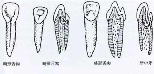 临床上可分为:畸形舌侧窝、畸形根面沟、畸形舌侧尖和牙中牙。