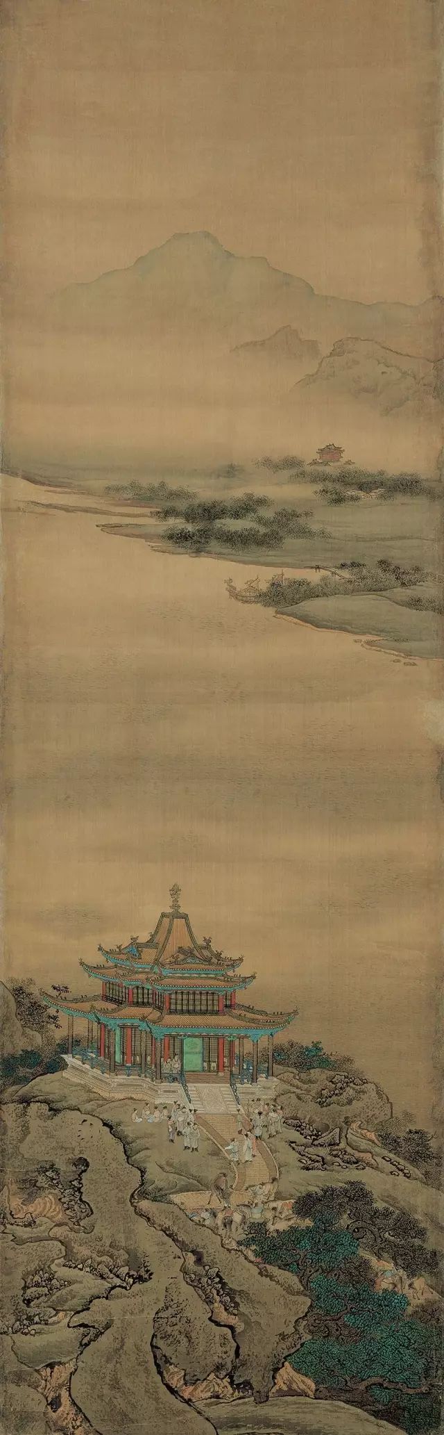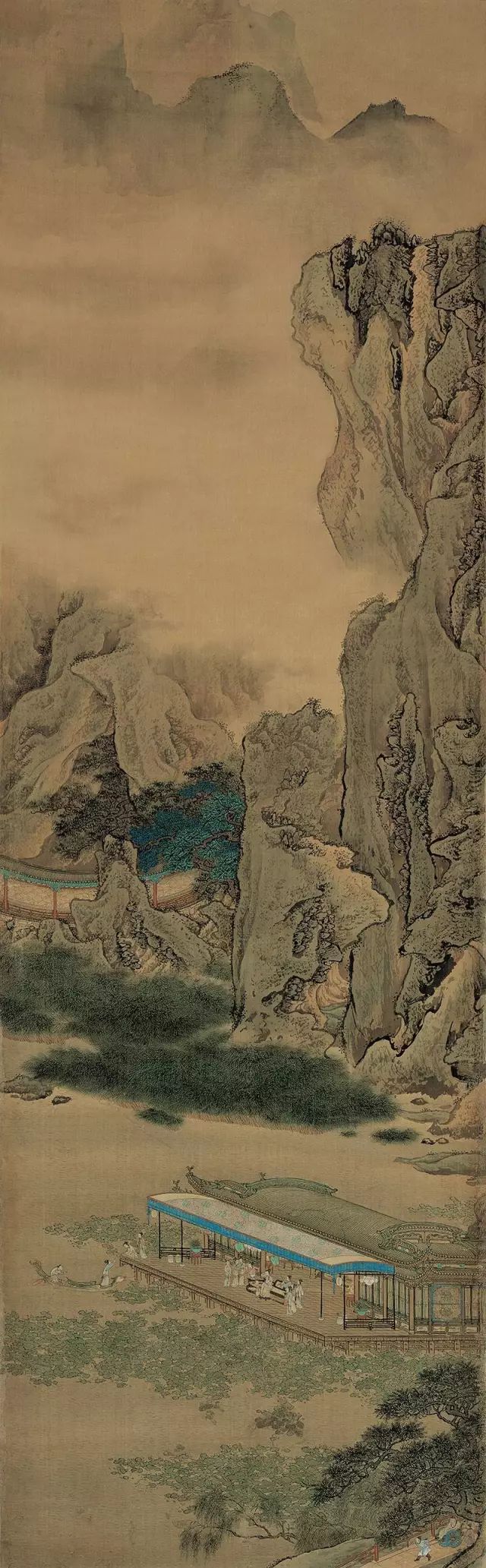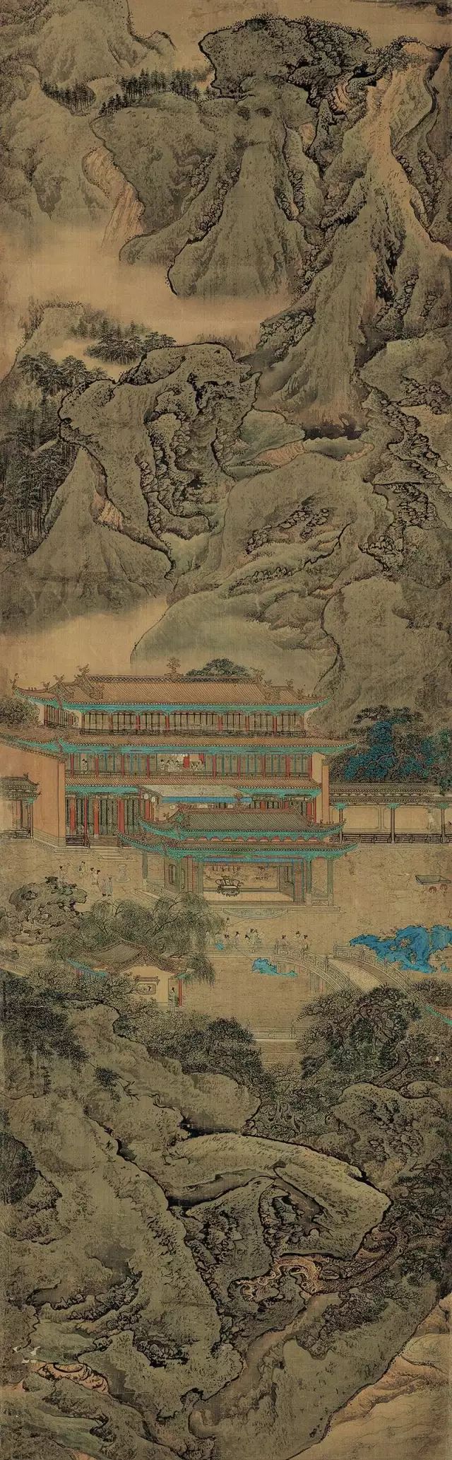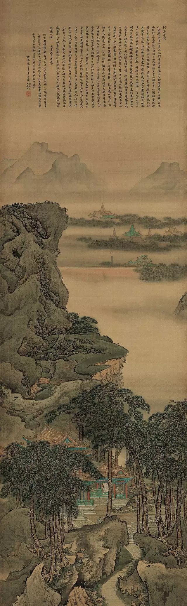 画家用唐朝诗人杜牧《阿房宫赋》文意,拟写阿房宫胜景。层峦耸翠,曲水萦环,重楼叠阁,各抱地势,廊腰缦迦,夏边行空,亭桥卧波,龙舟游荡。楼阁、人物,笔致细腻,生动入微。建筑物用大青绿敷色,浓盛厚重,鲜艳夺目,山石树木则用水墨,略施淡彩,主次分明,整体则气势宏大,局部则各显精神,是袁耀晚期至精之作。自题“拟阿房宫意”,署款“庚子阳月”、“邗上袁耀”,钤“耀之囗”、“昭道”白、朱文二方印。庚子为乾隆四十五年,为迄今所见袁耀画作时间最晚者。