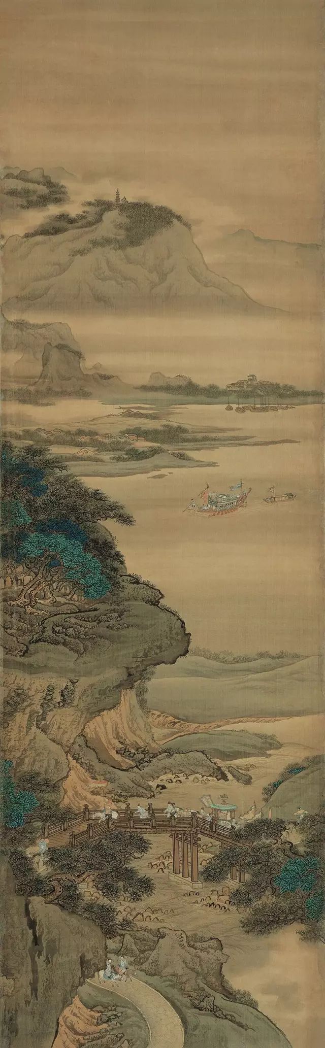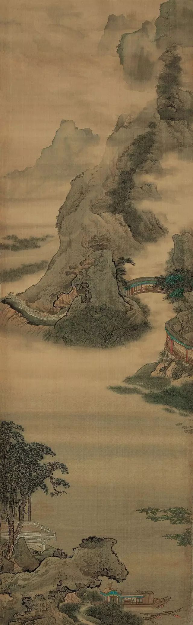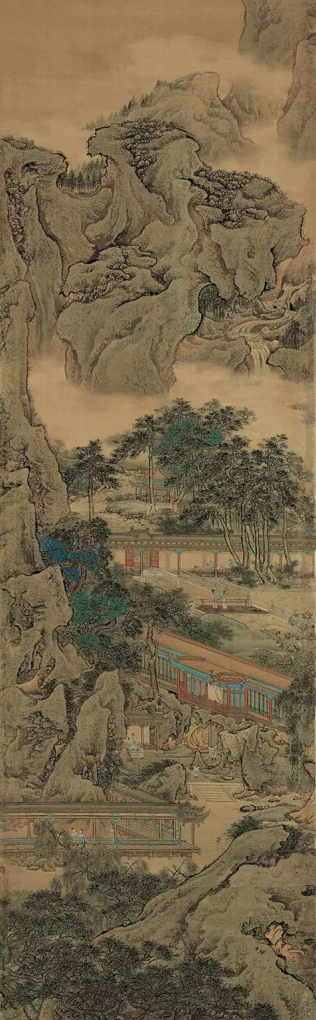 画家用唐朝诗人杜牧《阿房宫赋》文意,拟写阿房宫胜景。层峦耸翠,曲水萦环,重楼叠阁,各抱地势,廊腰缦迦,夏边行空,亭桥卧波,龙舟游荡。楼阁、人物,笔致细腻,生动入微。建筑物用大青绿敷色,浓盛厚重,鲜艳夺目,山石树木则用水墨,略施淡彩,主次分明,整体则气势宏大,局部则各显精神,是袁耀晚期至精之作。自题“拟阿房宫意”,署款“庚子阳月”、“邗上袁耀”,钤“耀之囗”、“昭道”白、朱文二方印。庚子为乾隆四十五年,为迄今所见袁耀画作时间最晚者。