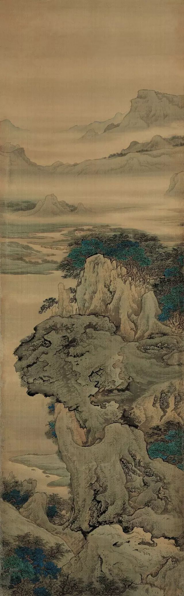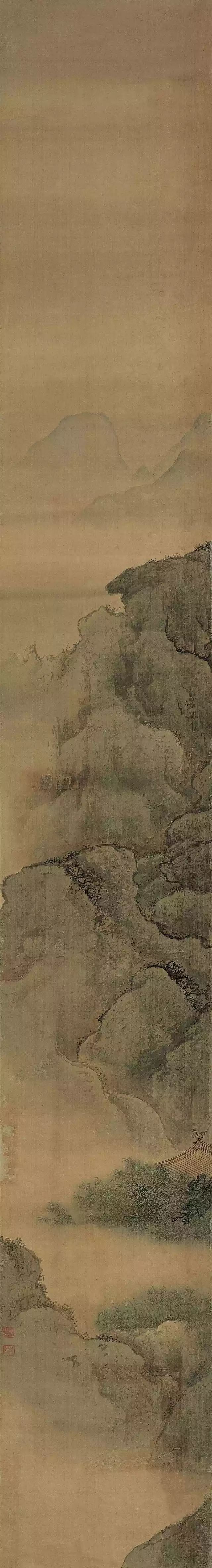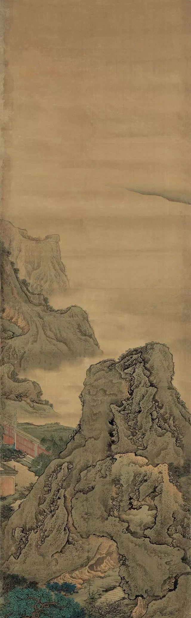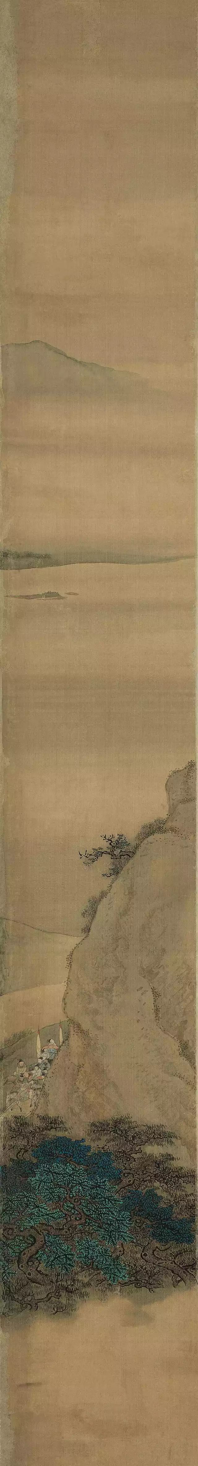 画家用唐朝诗人杜牧《阿房宫赋》文意,拟写阿房宫胜景。层峦耸翠,曲水萦环,重楼叠阁,各抱地势,廊腰缦迦,夏边行空,亭桥卧波,龙舟游荡。楼阁、人物,笔致细腻,生动入微。建筑物用大青绿敷色,浓盛厚重,鲜艳夺目,山石树木则用水墨,略施淡彩,主次分明,整体则气势宏大,局部则各显精神,是袁耀晚期至精之作。自题“拟阿房宫意”,署款“庚子阳月”、“邗上袁耀”,钤“耀之囗”、“昭道”白、朱文二方印。庚子为乾隆四十五年,为迄今所见袁耀画作时间最晚者。