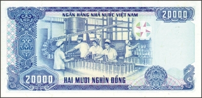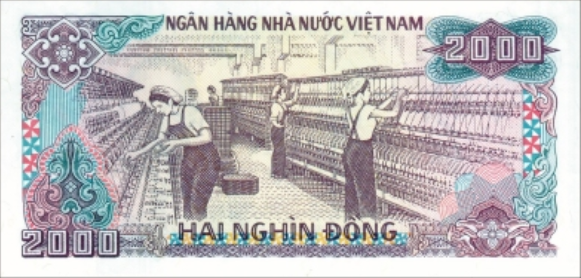 2000盾,背面印有越南女工在纺织车间工作的图片.