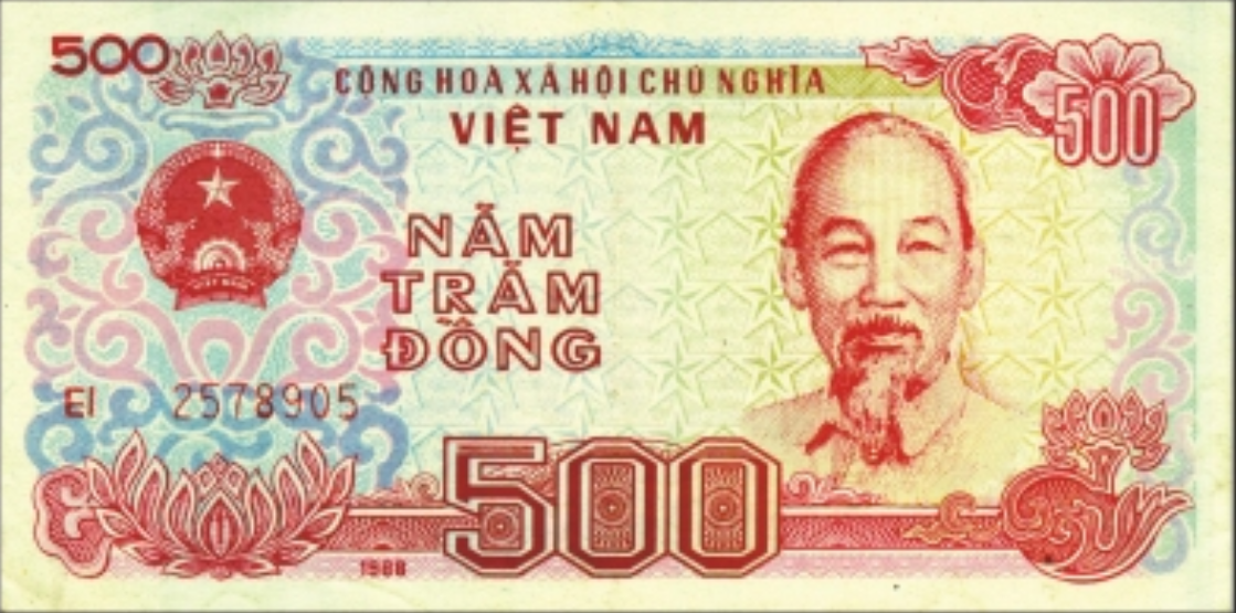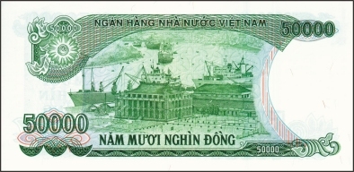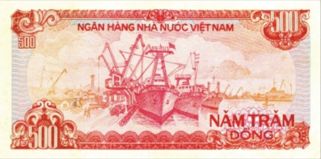 500盾,200盾到500000盾正面印的都是越南主席胡志明与越南国徽,后面就不一一描述了,500盾后面印的是越南北部最大的海港,海防港,也是越南第二大的海港。