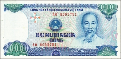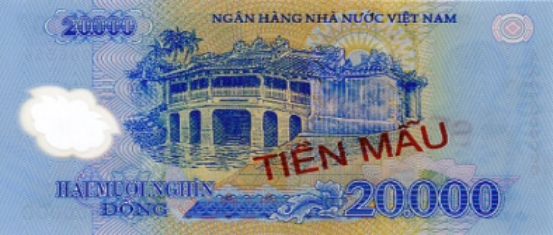 20000盾,背面印有越南会安的Cau Pagoda桥。由于此桥是由日本商人兴建的也被称为’日本桥。