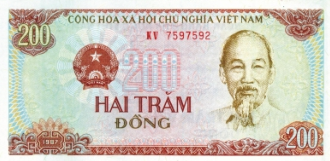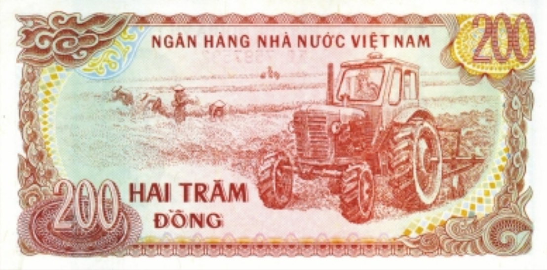 200盾,正面印有越南主席胡志明头像与越南国徽,背面印有越南农民开拖拉机耕地的图片。