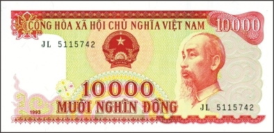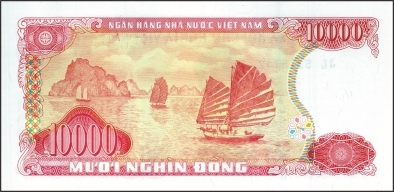 10000盾,背面印有位于越南湄公河三角洲东近海的东海九龙(Cuu Long)盆地的白虎(Bach Ho)油田。