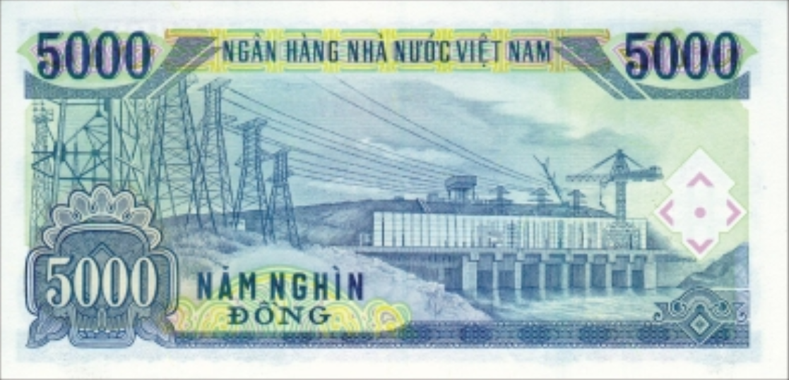 5000盾,面印有越南同奈何上的治安(Tri An)水电站。