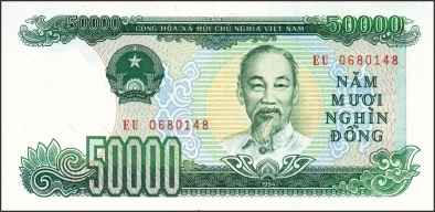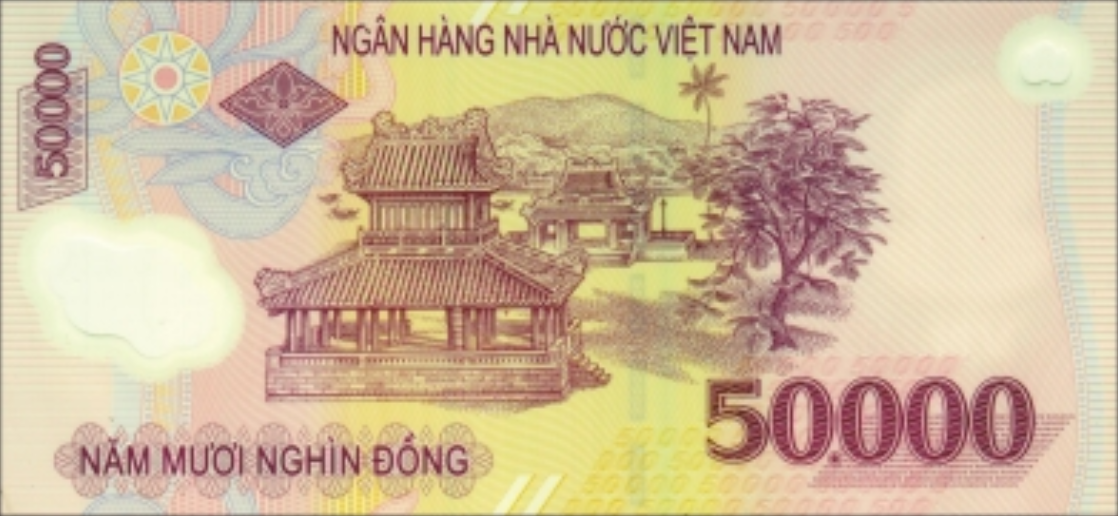 50000盾,背面印有越南承天-顺化的陈德良(Lương Định Của)亭和富文楼(Phu Van Lau)。