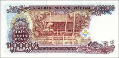 100000盾,背面印有位于越南河内西侧的文庙—国子监(Quốc Tử Giám)。
