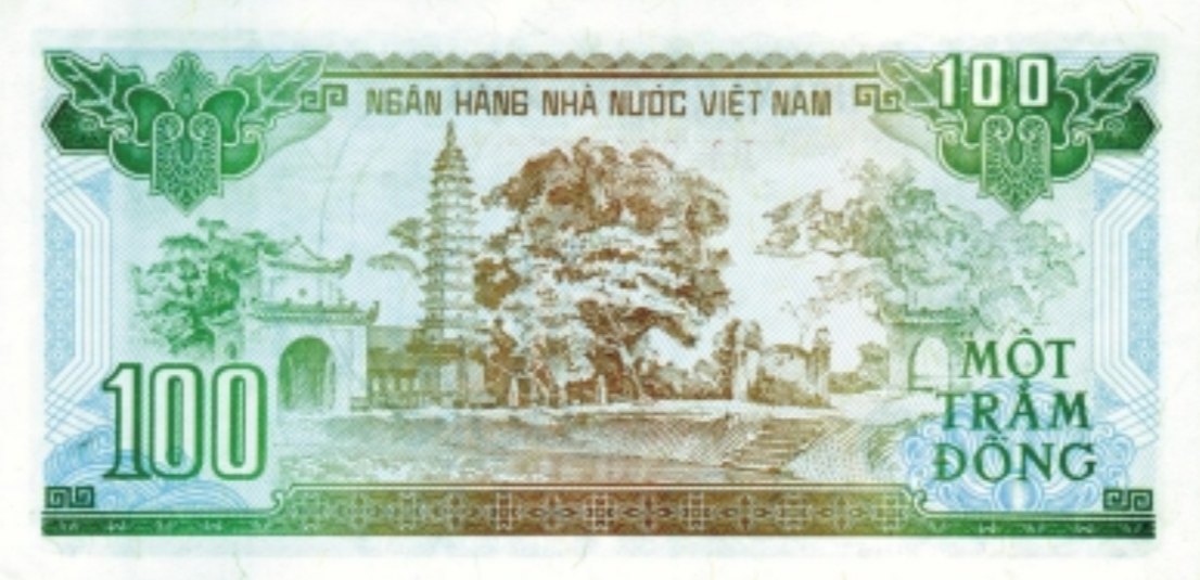 100盾,正面有越南国徽,背面南定的普明(Pho Minh)塔。