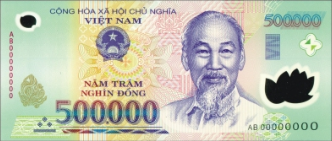 500000盾,背面印有越南义安省南坛县金莲乡黄筹村的胡志明出生地。