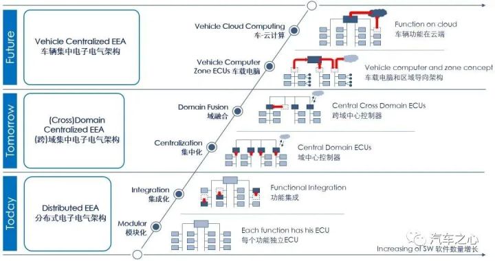 但是,如你我所见,电动车和自动驾驶技术席卷了整个行业,大量新出现的 ECU 和信号传输效率需求,让原来的分布式 E/E 架构受到挑战,甚至正在成为技术发展的桎梏。
