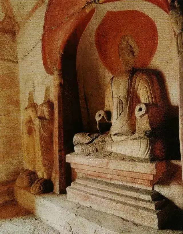安阳灵泉寺大留圣窟在寺东岚毕山麓,内外剥蚀非常严重,原有雕刻状况已无法辨认。窟内三面沿壁作低矮的基坛,坛脚刻神王,刀法草率,技艺一般。据铭文可知,此像作于北齐武定四年。坛上每面置叠涩座,上坐一佛,头手均缺失。各佛身躯较粗壮,衣裳贴身较紧,所雕衣纹浅薄,已完全没有北魏传统的痕迹,显示出后来常见的北齐雕刻风格。比如,安阳灵泉寺大留圣窟正本主佛,是这种新风格的典型。
