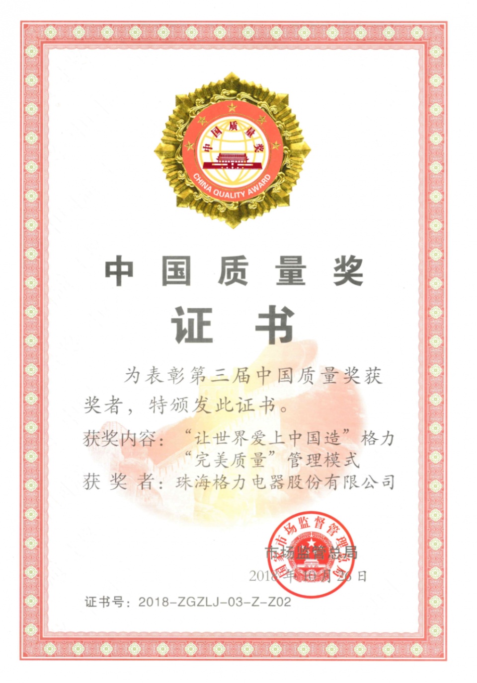 (图为格力获“中国质量奖”证书)