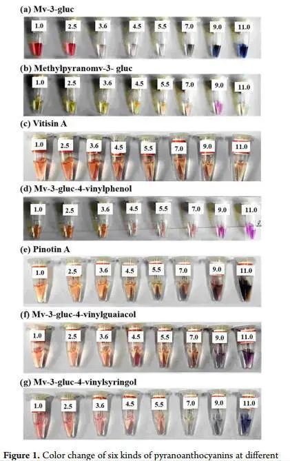 吡喃花色苷是一类由花色苷衍生的色素,由Cameira-dos-Santos等人于1996年首次在红葡萄酒中发现。近年来检测和研究最多的是羟基苯基吡喃花青素、葡萄糖苷、乙烯基黄醇吡喃花青素、门冬青和玫瑰花青素B。花色苷具有很强的抗氧化、降血糖、抗肿瘤和抗炎活性。然而,单体花色苷高度不稳定,易受光、氧、温度、pH、结构和自身浓度的影响而降解。吡喃花色苷作为花色苷的一类衍生物,表现出比其前体更高的稳定性。鉴于花色苷对葡萄酒色泽和生物活性的重要贡献,深入了解花色苷及其衍生物(如吡喃花色苷)的结构特征、稳定性和生物活性具有重要意义。