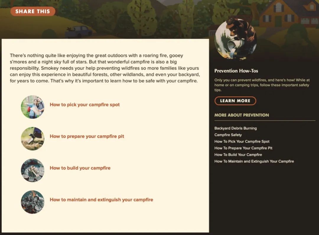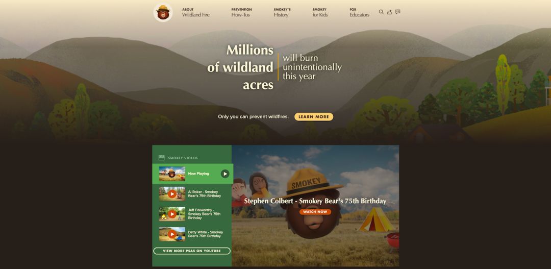 这凸显了Smokey Bear传递出的主要信息:我们的大多数野火是可以预防的。随着时代的变迁,广告委员会扩大了斯莫基熊的数字化存在,培养社区传播预防野火的信息,并且建立网站SmokeyBear.com,开通了各路社交媒体频道(Twitter、YouTube、Facebook和Instagram)提供全面的野外防火教育和提示。