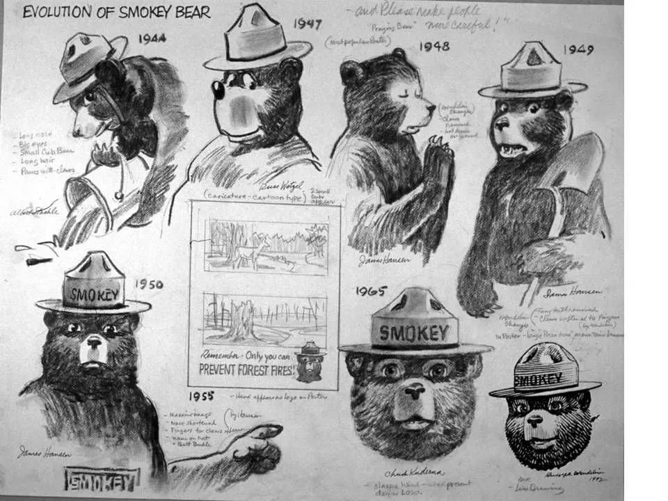 他的名字的灵感来自“斯莫基·乔·马丁”,纽约市消防局的英雄。于是Smokey Bear在美国林务局和艺术家鲁道夫·文德林(Rudolph Wendelin)的合作下诞生了。这位最萌公务员的首次亮相,是在1944年8月9日。Smokey Bear的第一张海报是由艺术家Albert Staehle在10月10日发布的。斯莫基说:“你的小心谨慎,会防止百分之九十火灾的发生!”然这个时期的斯莫基并没有广泛的为人所知。