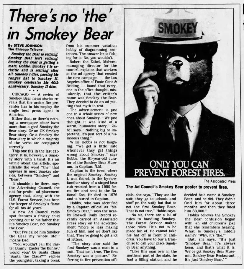 1975年5月2日,“Smokey Bear”正式“退休”,并在官方仪式上授予他的儿子“斯莫基熊2号”的称号。