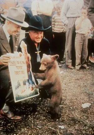 直到1950年的一个春日,在新墨西哥州的卡皮坦山区,发生了一场大火,当工作人员为遏制大火而战时,看到一只孤独的小熊在火线附近徘徊。它被救时躲在一棵完全烧焦的树上,没有生命危险,但脚掌和后腿烧得很厉害。新墨西哥州狩猎和渔猎部的护林员雷·贝尔听说了这只幼崽,就带它去了圣达菲,在当地兽医埃德温·j·史密斯博士的帮助下,他和妻子露丝、孩子唐和朱迪一起照顾这只小熊。