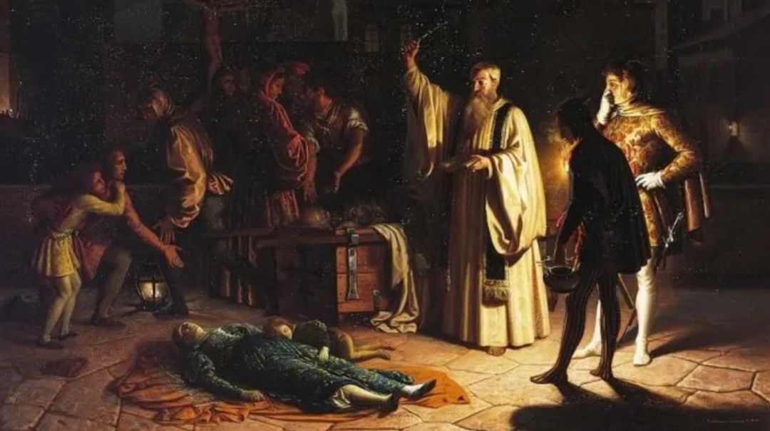 越来越多人认为黑死病是神降下的惩罚,教堂强调通过宗教仪式进行救赎,而对抗瘟疫的正确方式是忏悔 —— 当时许多绘画,都描绘了受难者接受牧师祈福的场面。