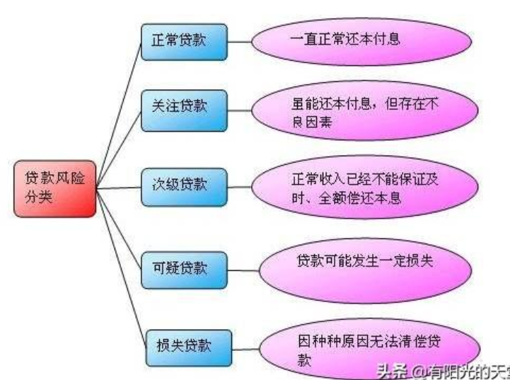 贷款五级分类是商业银行依据借款人的实际还款能力进行的贷款质量的分类,按风险程度将贷款划分为五类:正常、关注、次级、可疑、损失,后三种为不良贷款。正常类贷款:借款人能履行合同;关注类贷款:存在不利因素可能会影响债务偿还;次级类贷款:借款人还款能力出现明显问题;可疑类贷款:借款人不能足额偿还贷款本息;损失类贷款:预计本息损失在90%以上。