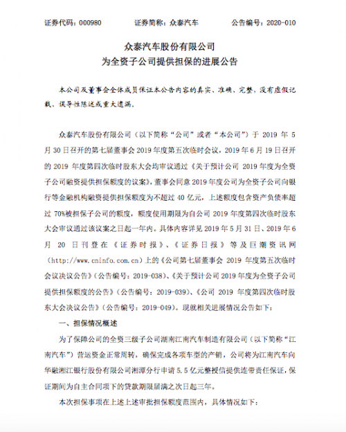 同日,众泰汽车还发布《为全资子公司提供担保的进展公告》。公告显示,为了保障公司的全资三级子公司湖南江南汽车制造有限公司(以下简称“江南汽车”)营运资金正常周转,确保完成各项车型的产销,公司将为江南汽车向华融湘江银行股份有限公司湘潭分行申请5.5亿元整授信提供连带责任保证,保证期间为自主合同项下的贷款期限届满之次日起三年。