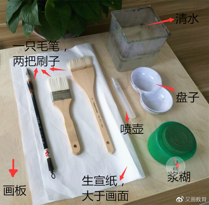 木板、毛笔、刷子、宣纸、喷壶、盘子、浆糊、清水等,当然你还要先有一张画。