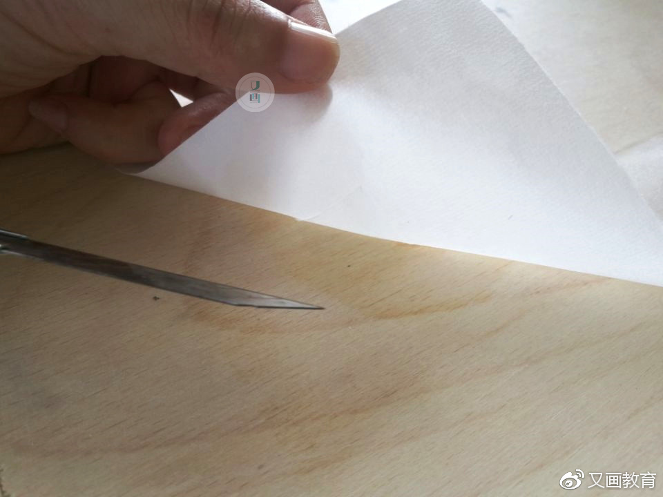 7. 小心翼翼的把画揭起来,有时候两层纸没一起起来就用小刀挑一下。画正面向自己贴。