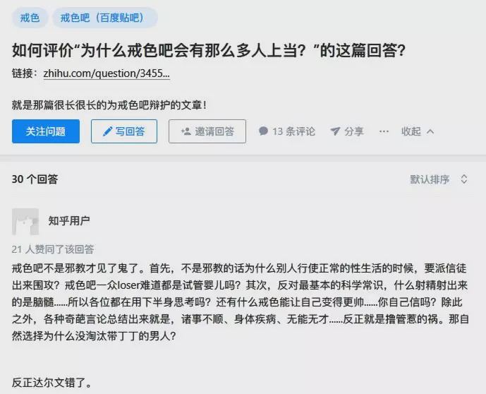 基哥去另外一个更加理性的社区知乎看了一下,这里的老哥直接就把戒色吧打上了“上当”、“邪教”的词语。
