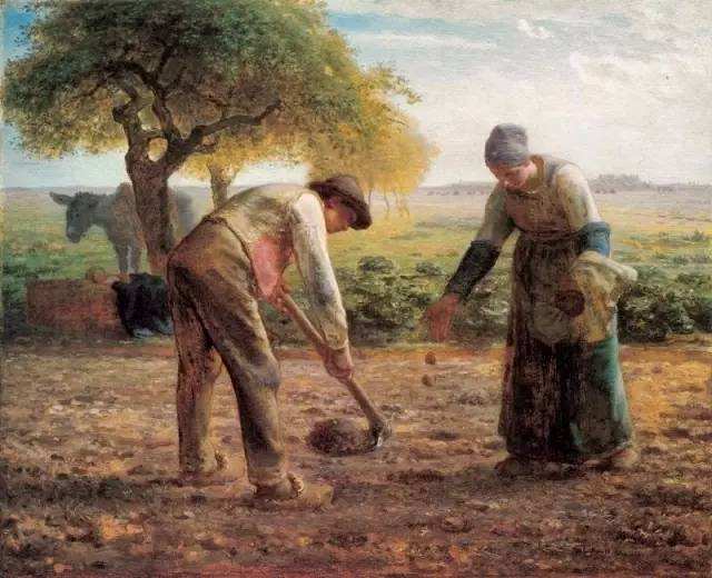 米勒在1849年的时候带着妻儿来到这里,并且在这里定居,过着农夫的生活,巴比松是米勒艺术进入成熟阶段的地方,在这里他日出而作,日落而息,一边辛勤劳作,一边作画,农民生活成了他创作的主要题材。如果你了解米勒,你会发现米勒的作品有很多都是描述田园生活的,比如《播种者》《拾穗》《晚钟》等,不过这种画风在当时的社会很是受欢迎。