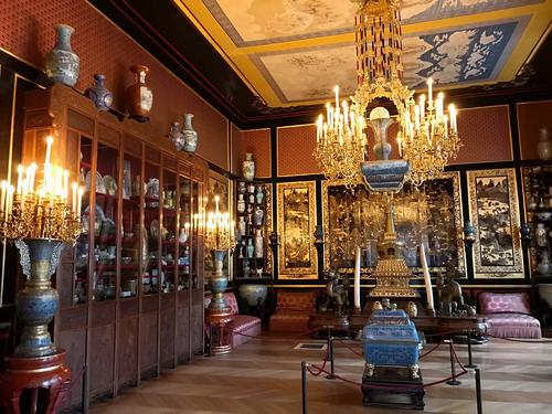 中国馆是枫丹白露宫里面单独收费的一个景点,一般中国游客来这里都不会错过这个房间,即便是其它宫殿不看,这里也是必须要打卡的,中国馆里面摆放的都是1860年法国军队从中国圆明园掠夺的物品,这里有18-19世纪的中国瓷器,还有中国的白玉、翡翠、水晶等,还有18世纪的景泰蓝搪瓷。
