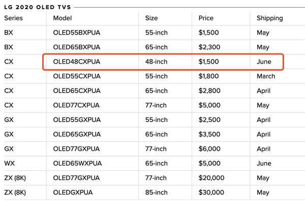 驱动中国2020年3月18日消息,近日,根据外媒报道消息称,LG 2020年的OLED电视即将从本月起陆续登陆美国市场,产品尺寸覆盖48英寸、55英寸、65英寸、77英寸以及85英寸等多个产品段,分辨率有4K、8K可选,产品价格最低为1499美元,最高则为29999美元(约合人民币21万元)。