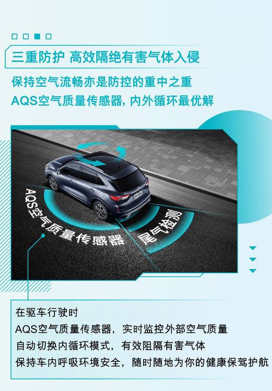 这套系统搭载AQS空气质量传感器,能够根据探测到的碳(氮)氧化合物浓度和PM2.5浓度自动切换空调内外循环,可以依据行驶路况和空气的质量情况,自动过滤污染物并带来新鲜空气,比如当你堵在尾气和尘土横飞路段,系统可以会自动转换到内循环,隔断被污染空气的进入。