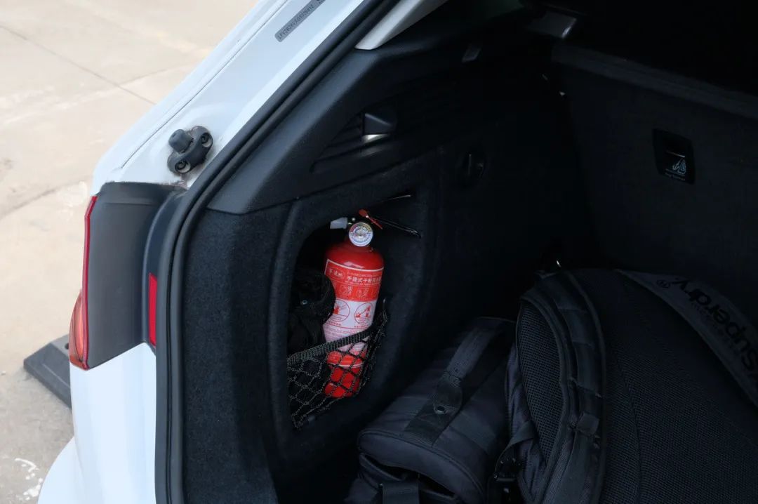 包包丢在车上,我建议把背包斜靠住灭火器的手柄部分,这样可以防止手柄上的拉环松散异响。(经验之谈哦!~)