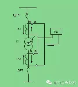 两侧电流互感器TAI和TA2之间的区域为差动保护的保护范围,保护动作于断开两侧断路器QFI、QF2。