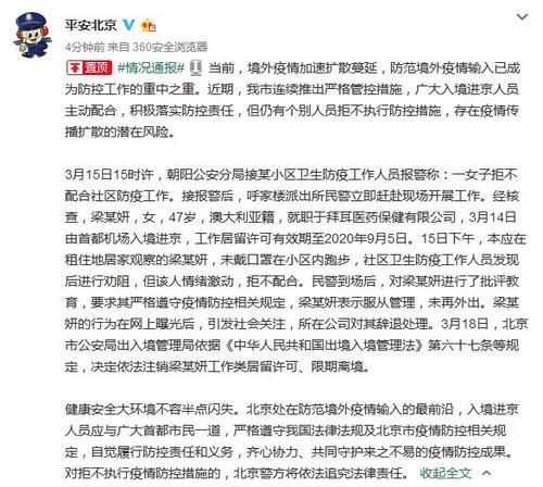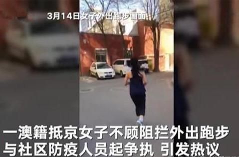 事情是这样的,这位澳大利亚华人,在北京某小区拒不执行居家隔离14天规定,擅自下楼跑步。当工作人员发现他进行劝阻时,她高喊"救命啊""骚扰"啊,还把工作人员拍出门外。面对警察的训诫,她居然喊,自己就是要跑步,不跑步生病了谁来管。警察说了一句"现在也只有国家管你,你到国外去可看看,谁愿意管你?"