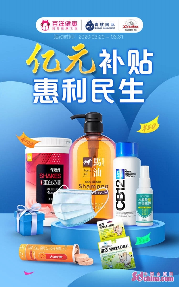 青岛市商务局局长赵世玉介绍,本次消费季活动鼓励倡导商家,特别是“线上”企业开展打折促销和让利优惠活动,并尤其提到百洋医药将联合青岛饮料集团发放1亿元消费券,自3月20日至3月31日期间,凡是登陆“青饮商城”或“百洋商城”的消费者便可领取数百元的抵用券用于购买商品,商品包括防疫产品、健康食品、美容产品、保健药品等。市民可以通过微信搜索“青饮商城”或“百洋健康”进行体验,所有领券消费者将长期享受“百洋”和“崂矿”的VIP优惠价格。
