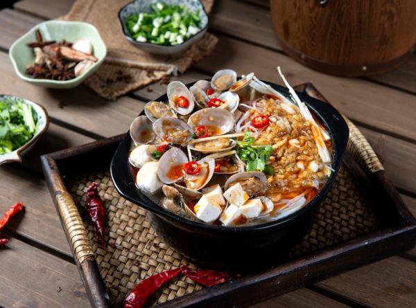 6、待花甲开口后,加入海鲜酱继续翻炒,同时加入高汤和少量糖,大火煮开后加入莴笋、嫩豆腐、金针菇、午餐肉和泡好的米粉,等再次煮开后转小火煮5分钟左右,撒上香菜后即可关火。