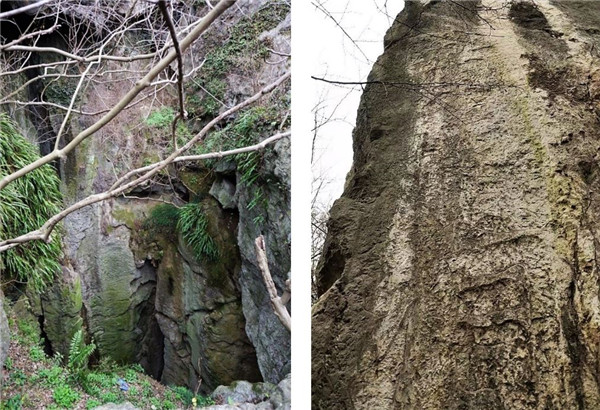黄龙洞离太史湾村不远,曾有公司开发旅游项目,周君10年前曾率学生考察。景区现已荒废,1966年发现的石灰岩溶洞黄龙宫大门紧锁,黄龙洞摩崖在丈人峰山顶,因罕有人迹,山路早被杂树覆盖。在文保所莫君率领下,一行人顺利攀登。摩崖中“黄龙洞”三个楷体大字相传为黄庭坚所书,又有绍定五年(1232)周弼及嘉熙二年(1238)程公许题记,“黄龙洞天”四字是明朝四十三代汉嗣天师张宇初题写。丈人峰背后即是黄龙洞,洞若巨井,深约40米,唐以前称金井洞。汉晋以来此处即是官民祈雨祷晴之处,宋人周密记载,“一穴幽深,真蜿蜒之所宅。居人于云气中每见头角,但岁旱祷之辄应”。苏轼有诗《和孙同年卞山龙洞祷晴》,“吴兴连月雨,釜甑生鱼蛙。往问卞山龙,曷不安厥家……寄语洞中龙,睡味岂不嘉……”众人围在洞口议论苏轼祈祷之时当有投龙简等投入洞中,不知今日是否尚在。其实2012年即有民间探险队绳攀至洞底探险,详情可参见网文《探秘黄龙洞深处》。下山时,钟画家所得颇丰,有废弃鸟巢、奇形藤杖、山顶青苔等物,陈先生亦觅得古生物牙齿化石,可谓满载而归。