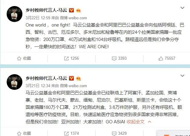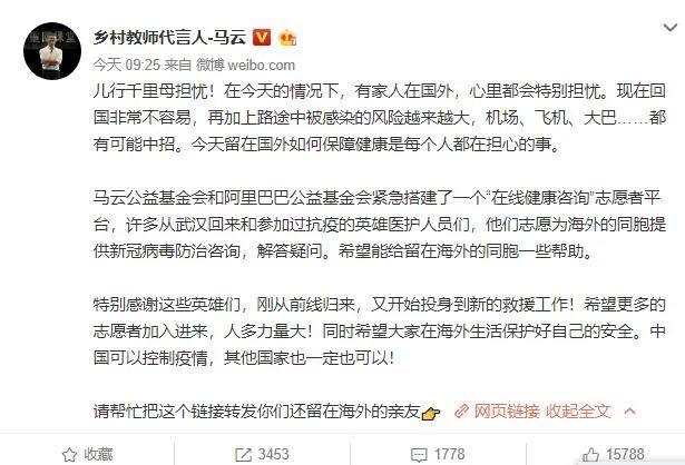 近期的疫情,是“马爸爸”微博的主题。从他连日来的多条微博中发现,“马爸爸”在这次抗疫战争中,做出了巨大的贡献。