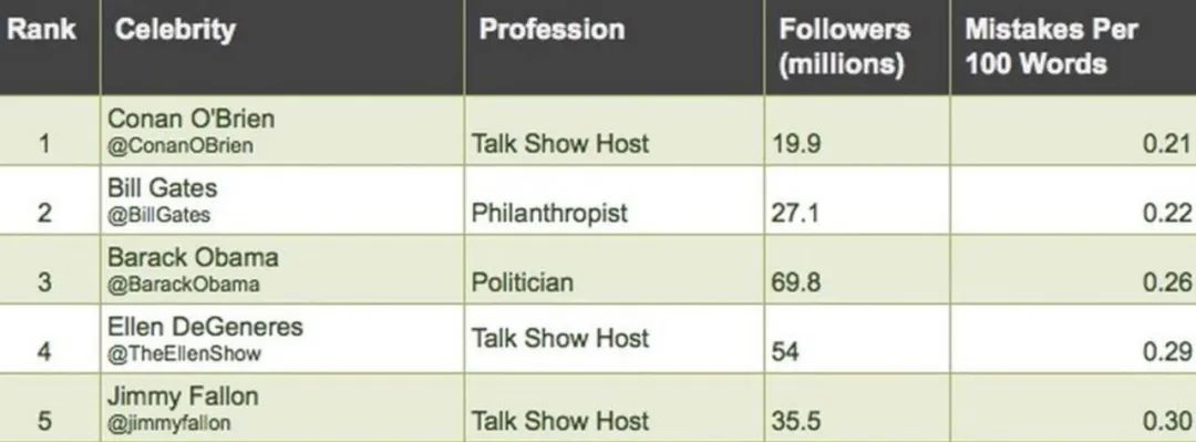 曾有个非常富有趣味性的研究。2016年,Grammarly对Twitter上粉丝最多的50个名人所发的150条推文进行了研究,排除了那些转发的推文,确保研究对象是这些名人自己说的。随后他们将这些推文放到Grammarly应用里,得出结果后,再让人类二次校对。