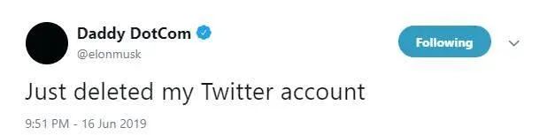 例如去年6月,埃隆·马斯克在Twitter上说,他“刚刚删除”了自己的Twitter账户,但当时网友并不清楚这是否只是一个玩笑。而他的Twitter帐户仍处于活动状态。不过,这与其在Twitter上闹出“特斯拉私有化风波”一事相比,不过是个无伤大雅的玩笑。