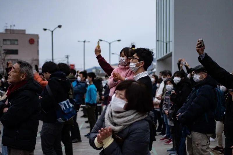 3月22日,在日本岩手县宫古火车站外,人们观看东京奥运会圣火传递