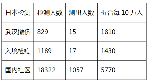 但1.26亿人口的日本,一直到3月23日,一共只检测了2万人出头。其中武汉撤侨829人、测出15人,入境检疫1189人、测出17人,国内18322人、测出1057人。