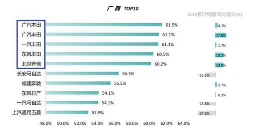 在2019年,虽然大部分的汽车品牌销量都出现了下跌,但保值率排名在前五的厂商销量反而还逆势增长,说明,保值率高对销量有一定的促进作用。