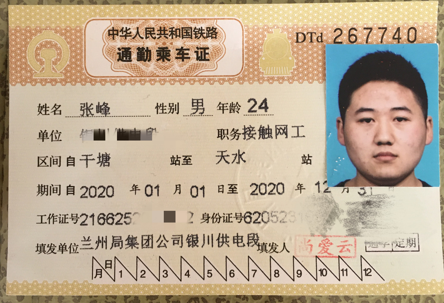 3月24日,热心兰州市民范先生拨打兰州晨报新闻热线96555反映,他在当天上午10点左右,途径金昌南路与甘南路十字路口东北角斑马线时,捡到中国铁路兰州局集团职工工作证一本,姓名为张锋,同时工作证隔层内装有其本人身份证、通勤乘车证及一张建行银行卡,身份证号为62052319961016xxxx。
