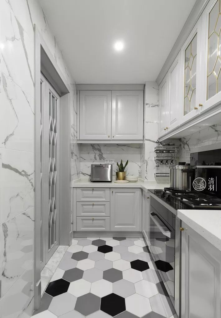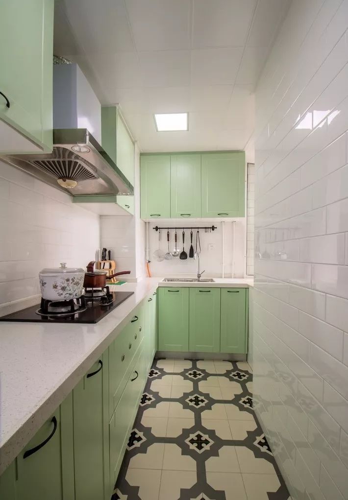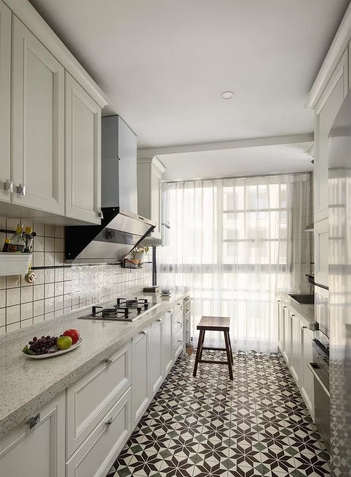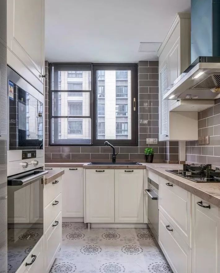 厨房的墙面一般比较单调,实用性远远胜过了装饰性,因而没有太大的亮点。如果用花砖进行装饰,和其他单色砖形成一个视觉上的对比,或许就能轻松打造视觉焦点了。
