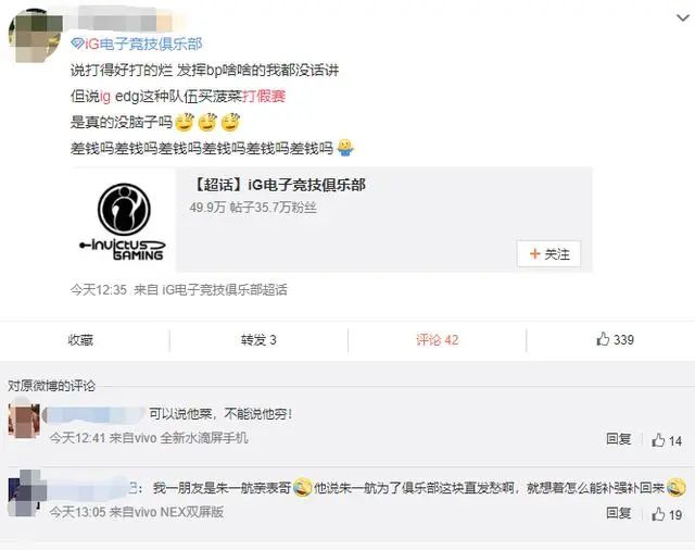 除了V5和JDG外,IG上次惨败给ES,也遭到玩家们的怀疑,有些玩家认为,IG之前实力超强,突然出现极大的拉垮,这种现象非常不合理,IG的节奏出现,很多IG粉丝开始回怼,表示IG战队老板是王思聪,选手一身名牌都不差钱,不屑于参与菠菜。