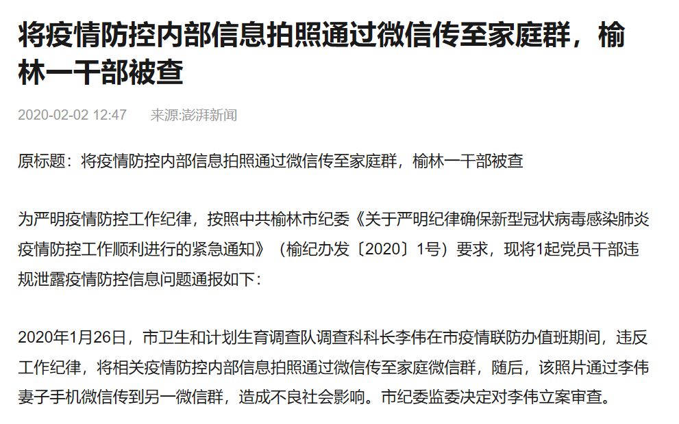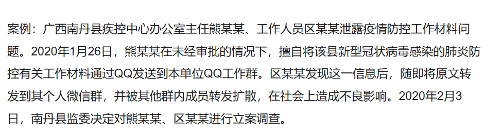 但是近期网上有一些关于泄露疫情信息的案例通报。其中,有些当事人被免职,或被给予行政处分或行政处罚,还有一些被立案调查。