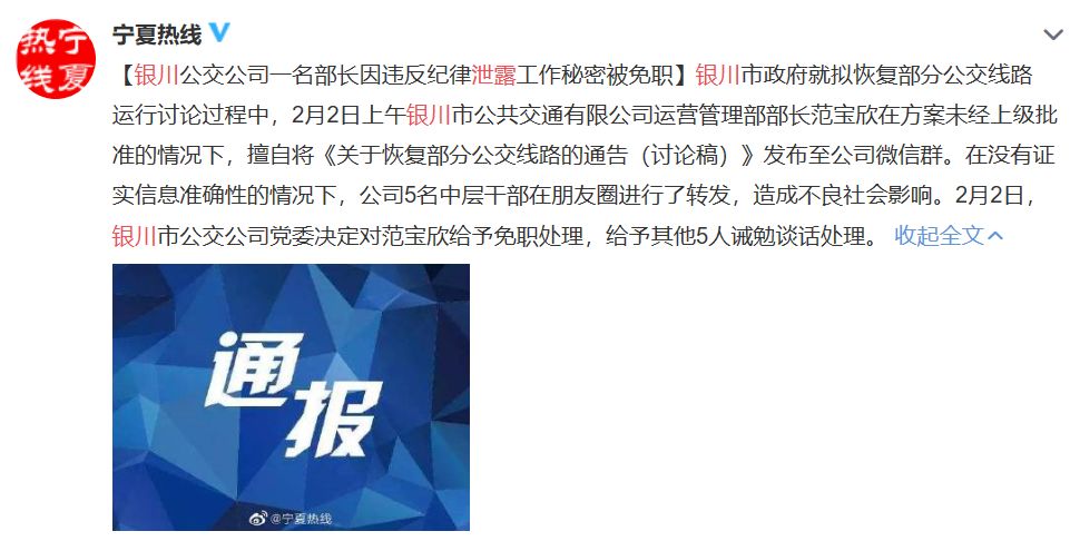某市政府拟恢复部分受到疫情影响的公交线路。在参与方案讨论过程中,2月2日上午,该市公交公司运营管理部部长范某在方案未经上级批准的情况下,擅自将《关于恢复部分公交线路的通告(讨论稿)》发布至公司微信群。在没有证实信息准确性的情况下,公司5名中层干部在朋友圈进行了转发,造成了不良社会影响。该市公交公司党委决定对范某给予免职处理,其他5人给予诫勉谈话处理。