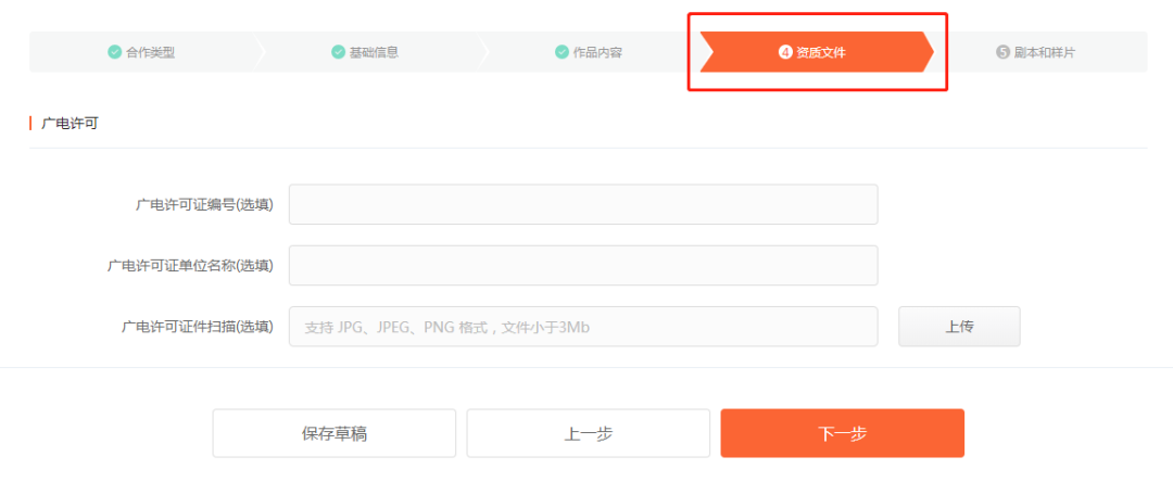资质文件:广电许可证编号、广电许可证单位名称、广电许可证扫描(选填);